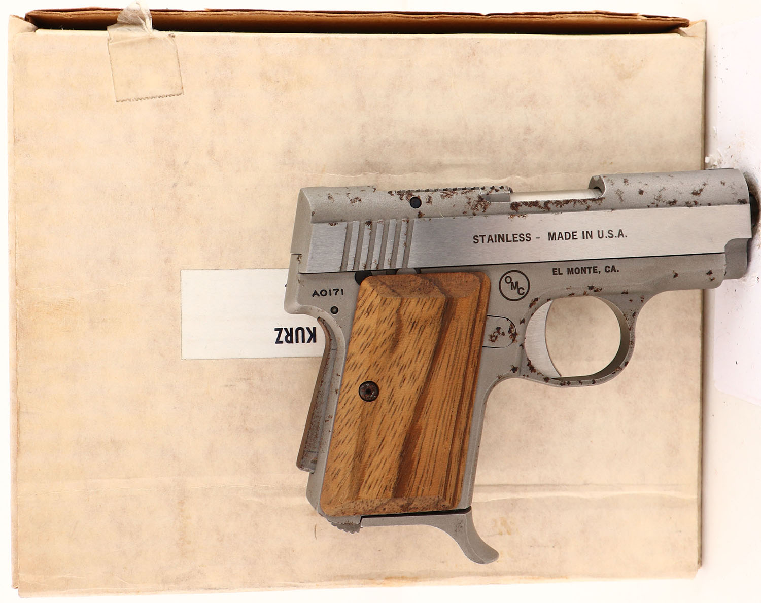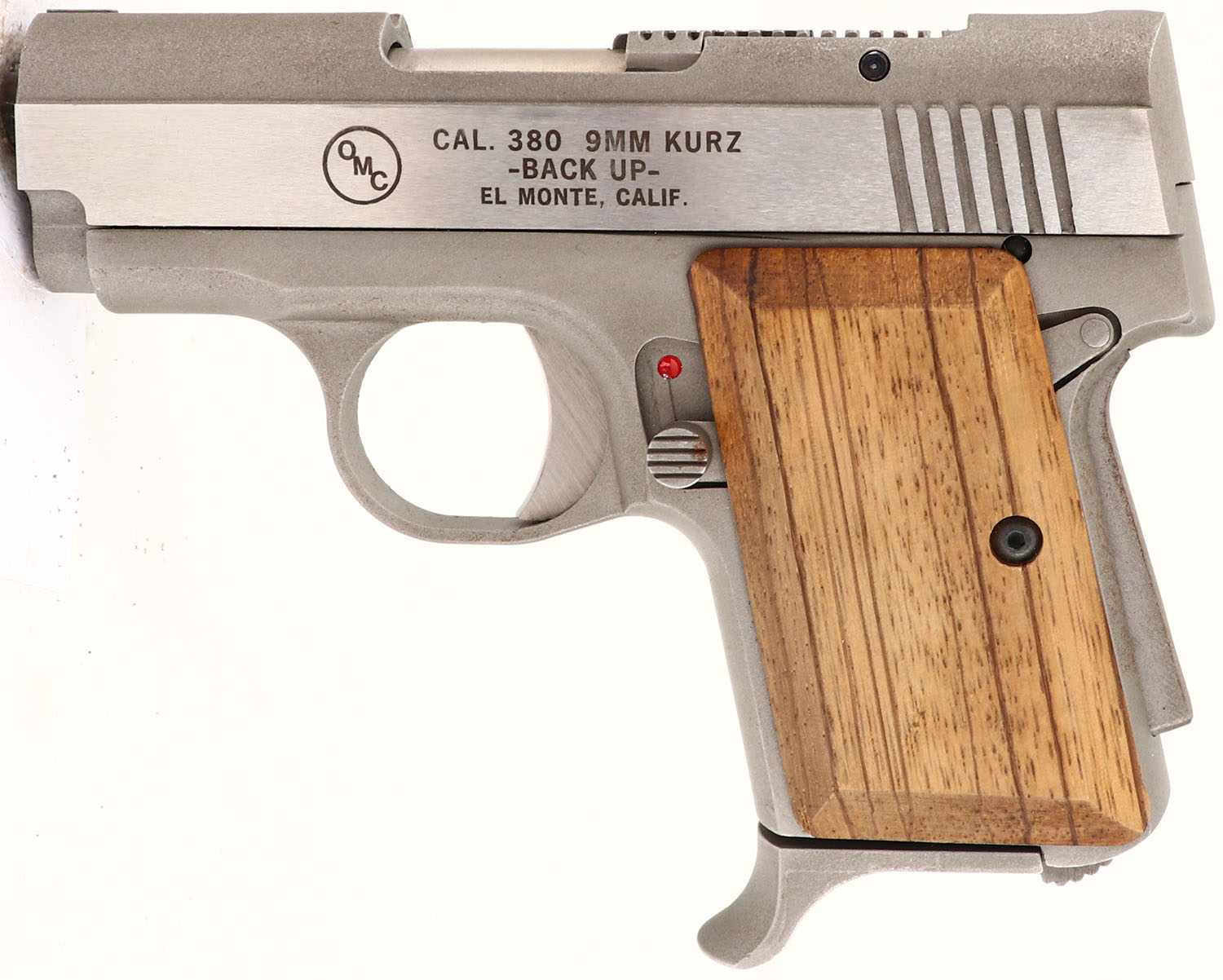 BOXED, OMC, Back-Up, CAL: .380 (9mm Kurz), MFG: 1970's-Mod, SN: A0171, Semi Auto Pistol, 2 1/2'' barrel, The smooth wood grips are excellent. The two-tone stainless steel finish is good, with intermittent rust spotting concentrated to the left side of the frame & slide. Bore is excellent. Fixed notch & blade sights. Comes in factory box, with related paperwork. FFL Req. - Value: 100 to 250