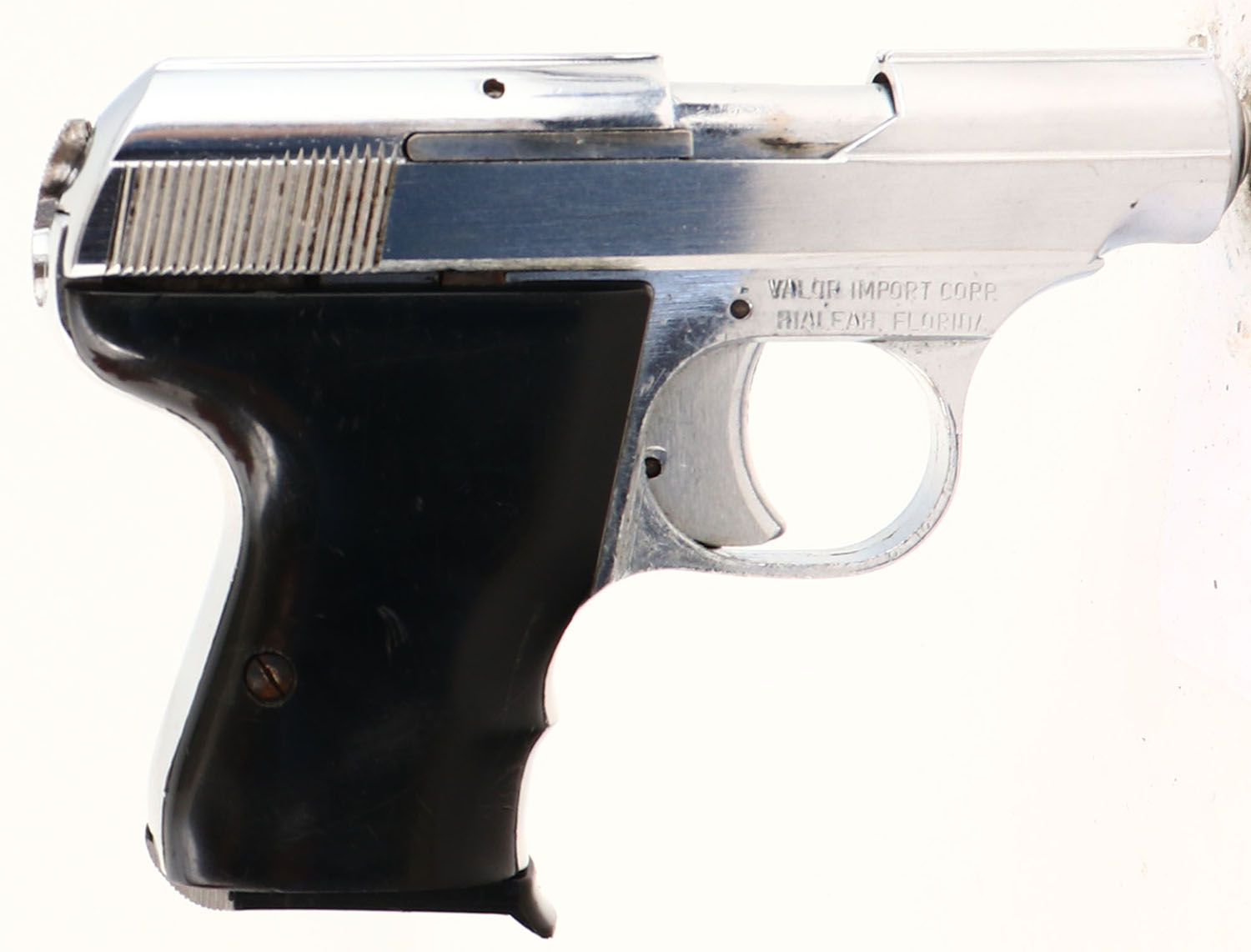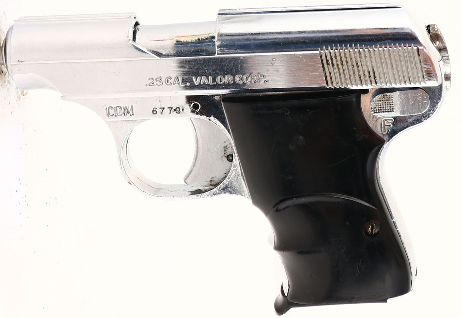 CDM (Imp. By Valor Corp), .25 Auto, CAL: .25 AUTO, MFG: 1960's, SN: 6773, Semi Auto Pistol, 2 1/4'' barrel. The synthetic grips are very good, with scratches & scrapes. The nickel finish is very good, with numerous visible striations & light brush marks. Bore is very good, with normal wear from use. Factory sights. FFL or C&R Req. - Value: 100 to 200