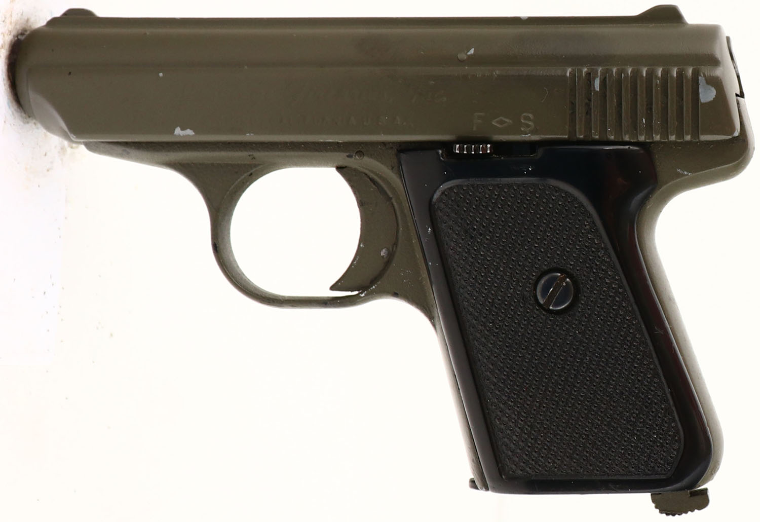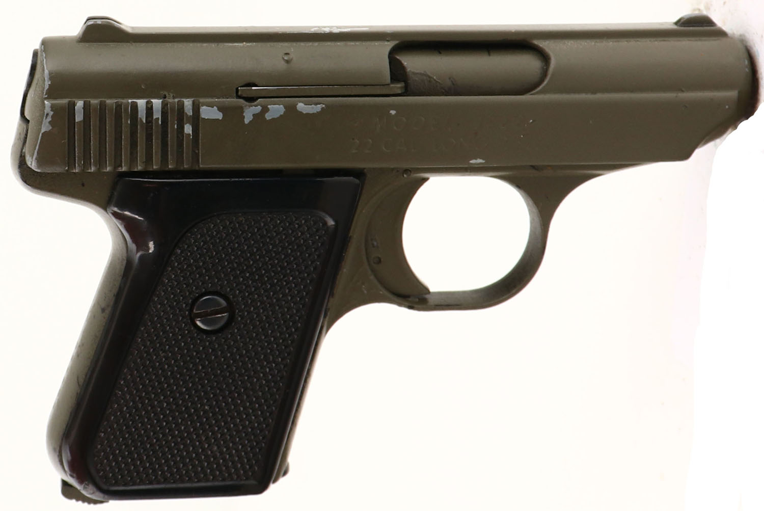 Jennings, Model J-22, CAL: 22LR, MFG: 1978/Modern, SN: 077809, Semi Auto Pistol, 2 1/2'' barrel. The checkered plastic grips are excellent, with a few scratches, scrapes & dings. The applied matte gray finish rates 90%. Bore is excellent, with visible light wear. Fixed sights. FFL Req. - Value: 100 to 150