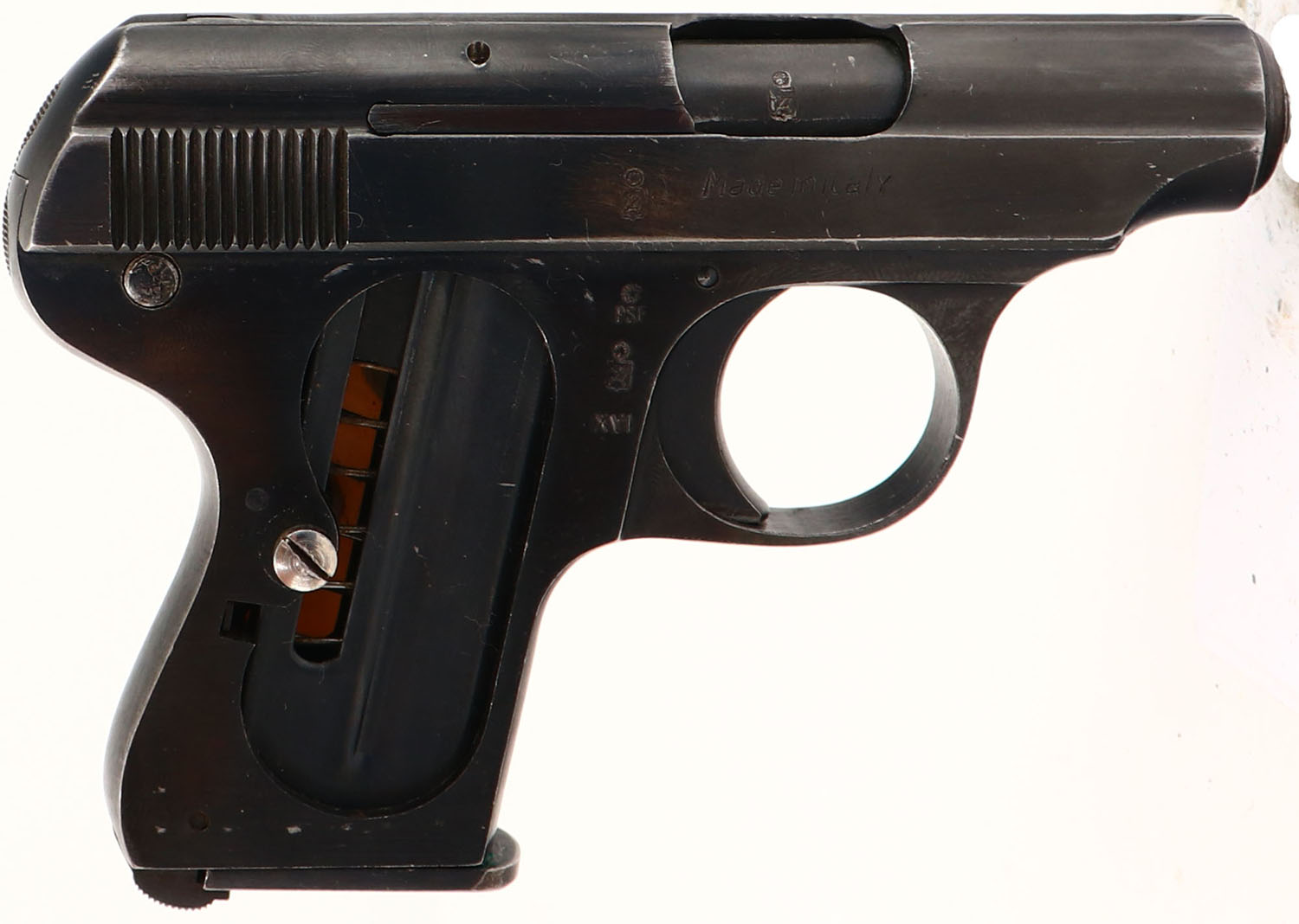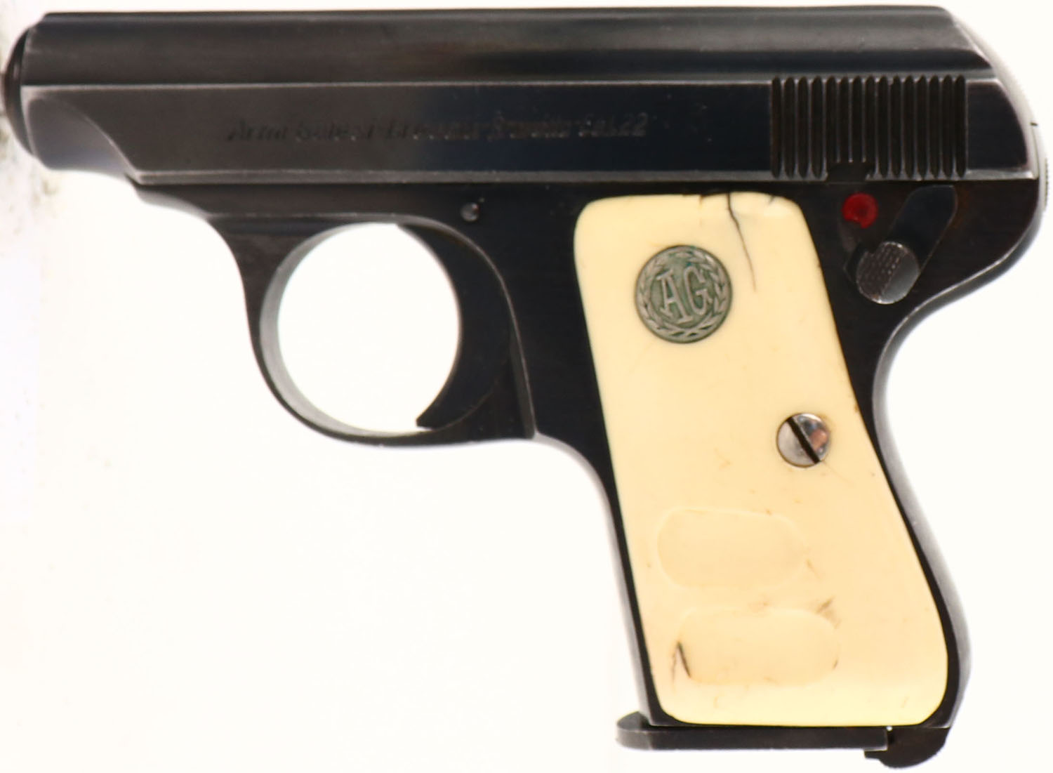 Armi Galesi, Brevetto, CAL: 22, MFG: N/A, SN: 116601, Semi Auto Pistol, 2 1/4'' barrel. The AG logo medallion checkered white plastic grip is good. There is a few small cracks above the medallion & one coming off the bottom of the screw hole. The right grip is missing. The metal blue finish rates 85%, with a few areas worn to metal gray & toned to a brown patina. Bore is excellent. Integral sights. FFL Req. - Value: 50 to 200