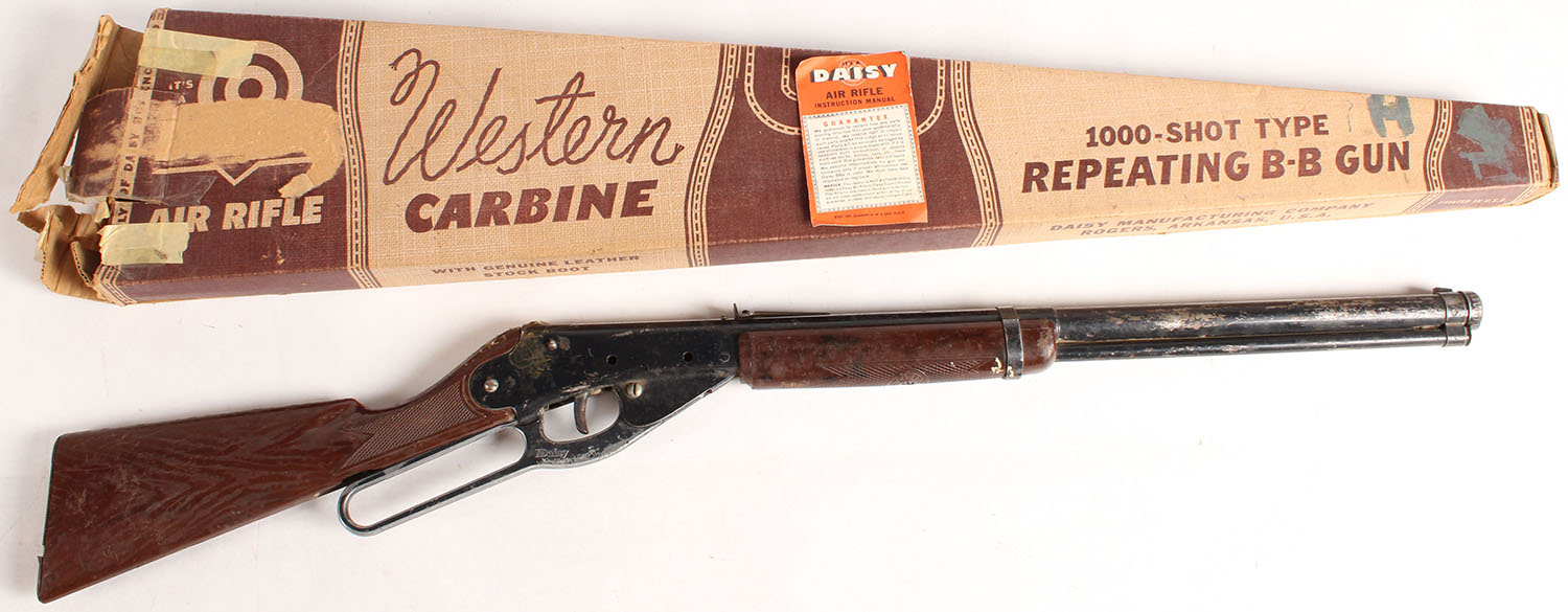 BOXED Daisy, Model 111 Western Carbine, BB/.175 cal., 1000 shot, plastic stock is well used, metal shows numerous scratches, has original instruction manual, box is nice but has some wear to end flaps. - Value: 6 to 30
