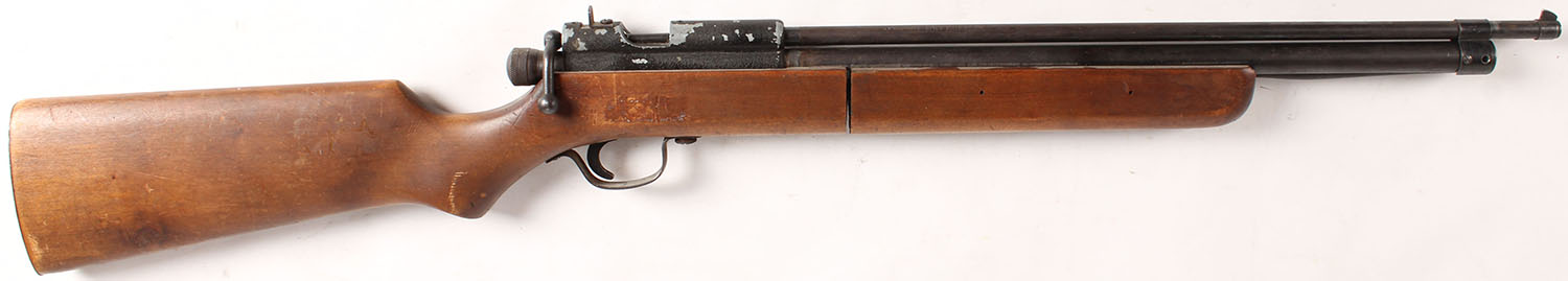 Rochester Arms, Air Rifle is the only model, a swinging air pump pneumatic, BA SS, two-piece wooden stock is solid with nicks & dings, the black crackled paint finish is nice with a few chips, may not hold air. - Value: 20 to 60