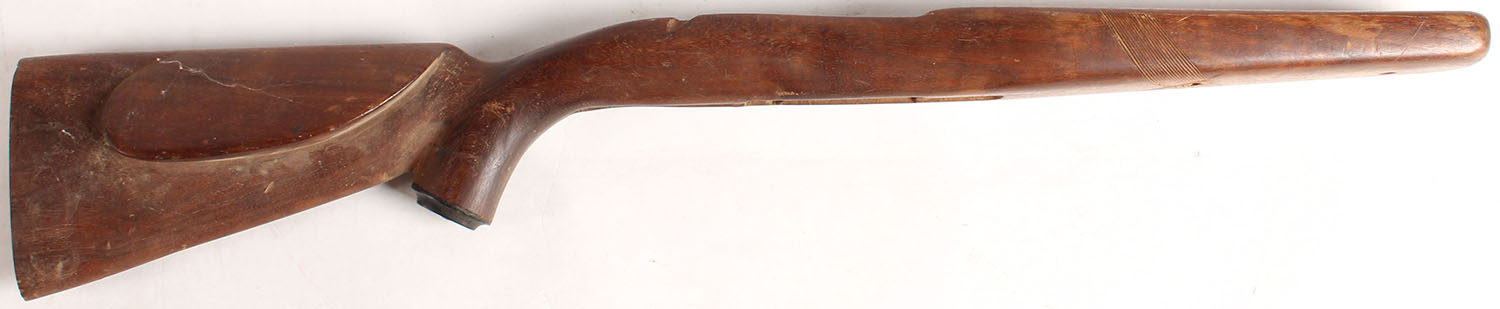 Unknown model LEFT HANDED walnut wood rifle stock. Aggressive raised cheeked right side of stock. No buttpad. Wide target style forend tip, capped pistol grip cap. Stock is finished, with moderate wear. Someone started to trace lines for checkering. Removed sling studs. - Value: 10 to 50