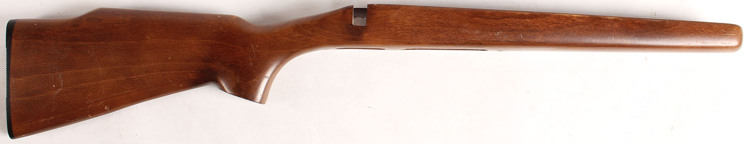 Remington, unknown bolt model rifle take-off stock. Slightly raised comb, plastic Remington buttplate. Straight cut bolt handle notch. Magazine slot in bottom. Factory finish is excellent, with some very minor dings or handling marks. - Value: 10 to 50