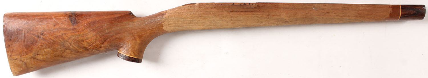 M1903 Springfield raw stock blank, Has rosewood caps on the forend & pistol grip, & cheeked left side. Has very nice wood grain. Wood stock, Has written on the inside of stock ''1903 Springfield'', ''semi-fancy w/rose wood tips'' & ''extra long'' along side of receiver channel. Has no buttplate,. Will need final fit, sanding & finishing. Grade: Excellent - Value: 10 to 150