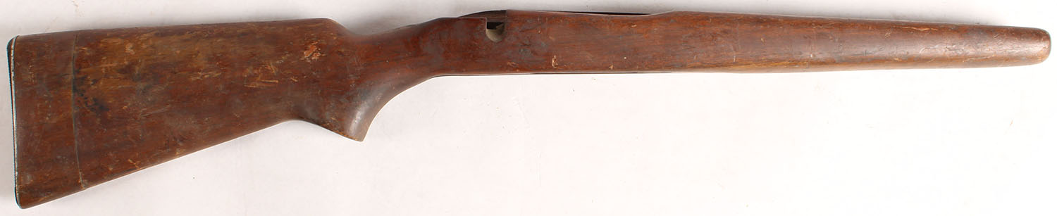 Remington model 722 bolt action take-off stock, Flat pistol grip. 2'' section of buttstock was cut off, saved & then later glued back on. Remains of original finish. No cracks or breaks. Has original Remington grooved metal buttplate. Grade: Good - Value: 10 to 30