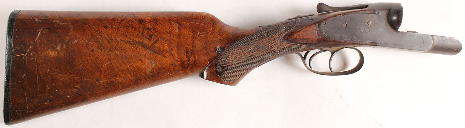 Lefever Arms Co. Sidelock Double barrel shotgun Receiver & stock, MFG: 1905, S/N: 54084H. The checkered & semi-pistol grip (missing cap), stock is good with numerus nicks, dings, scratches, gouges, dents, & wear from use/age. Attempts made to retrace checkering. The metal has toned to a dark patina with rust speckling. The sides of the receiver are marked with the ''Lefever Arms Co.'' name, The bottom is marked with the patent dates, & the water table is marked with the S/N. Has original checkered & logo buttplate. This lot is being sold ''AS-IS'', with NO RETURNS ACCEPTED. FFL or C&R Req. - Value: 40 to 160