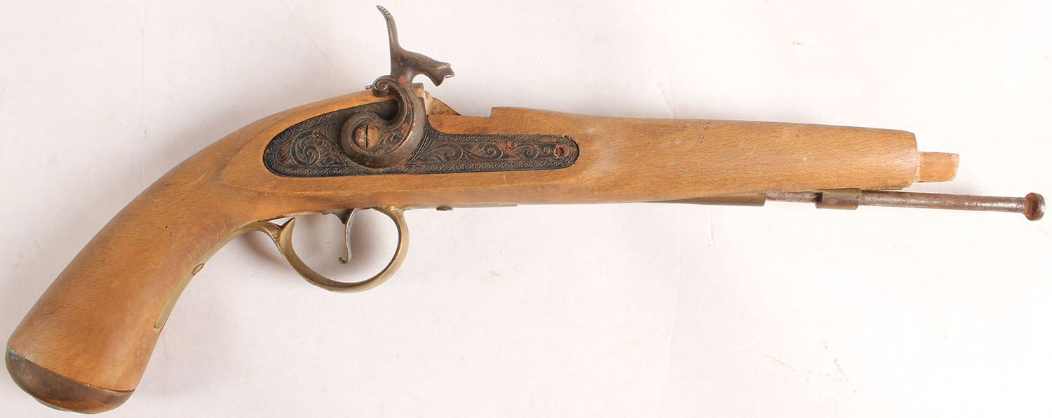 Percussion Pistol stock & lock, just missing a barrel. Metal parts have rust & tarnish. Grade: Very Good - Value: 20 to 60
