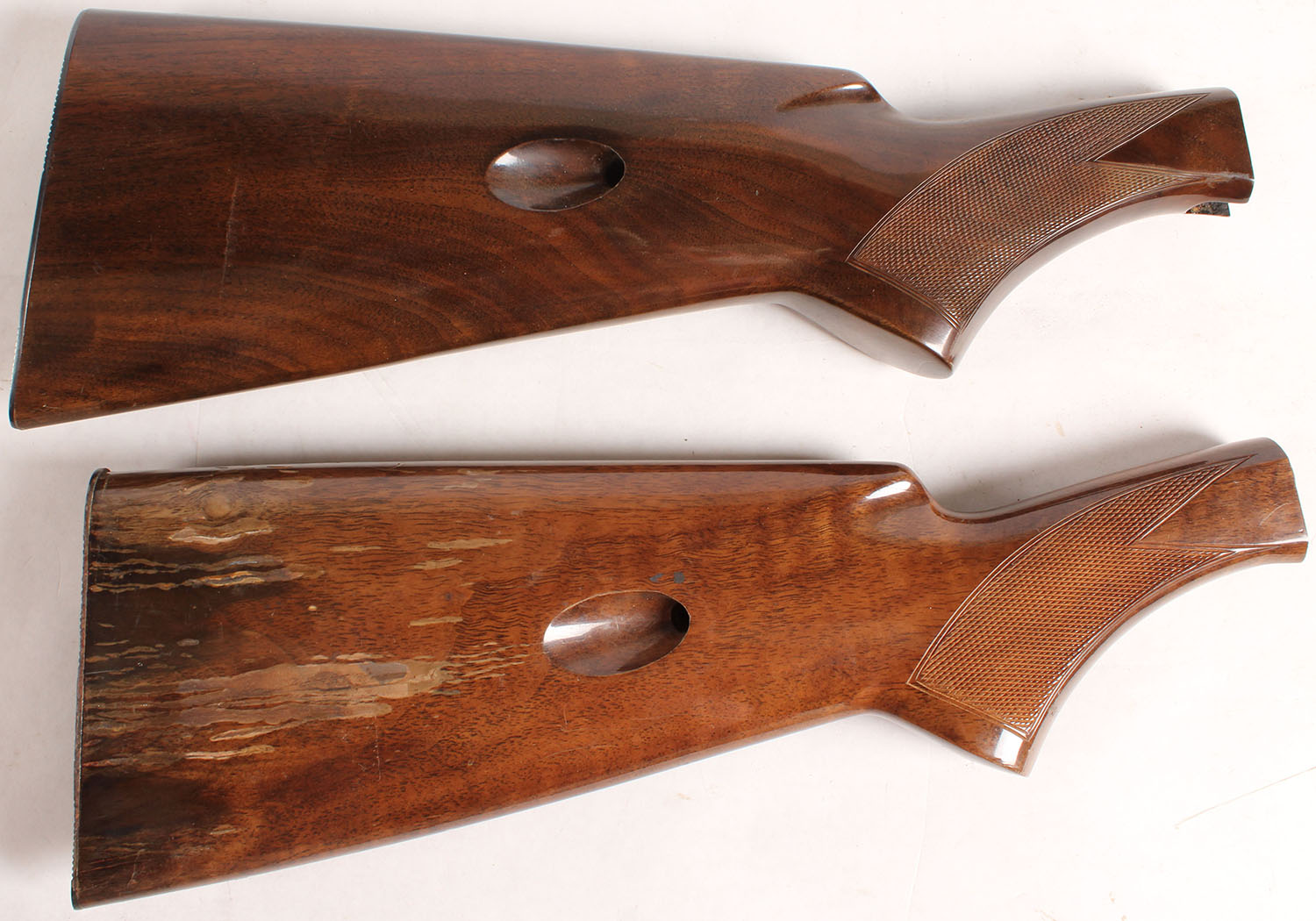 Lot of two Browning SAA .22 take-off buttstocks. Hand checkering. Both with original metal buttplates, one rusted. One with excellent original finish, one with moisture damaged original finish. Grade: Excellent & good. - Value: 50 to 250