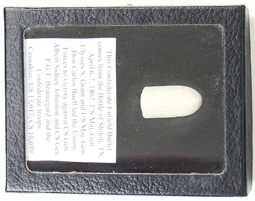 This confederate Enfield Bullet comes from the Battle of Shiloh, TN. April 6-7, 1862. US Maj. Gen. Ulysses S. Grant and US Maj. Gen. Don Carlos Buell led the Union Forces to victory against CS Gen. Albert Sidney Johnston and CS Gen. P.G.T. Beauregard and the confederate troops. Casualties: US 13,047; CS 10,699. Grade: Very Good - Value: 20 to 60