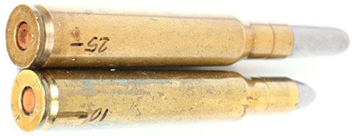 Lot of 2. .30-03 Springfield. (1) Gallery Load. HS:'' F A 1 05'', Pt lead. (1) Guard Load, HS:''F A 11 05'', RN Lead bullet. Grade: Excellent - Value: 20 to 40
