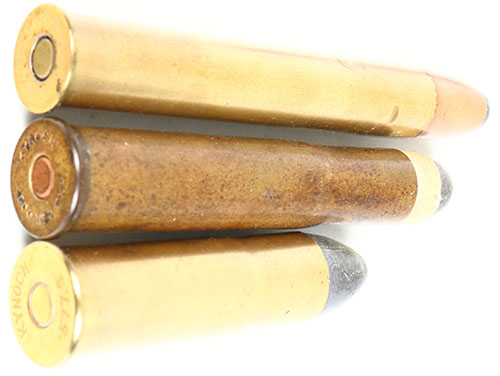Lot of 3. British Sporting Cartridges. (1) 577/500 #2 Express, HS:''KYNOCH 500 No2 EXP.'', RN PP Lead w/ copper tube. (1) 577 Snider, HS:''KYNOCH 577 S'', Flatnose Lead. (1) 500 Nitro Express, HS:''KYNOCH 500 NITRO''. Grade: Very Good ++ - Value: 30 to 60