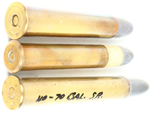 Lot of 3. (1) 40-70 Ballard. HS:''U.M.C. H 40-70 S'', FN Lead. 2 3/8'' case. (1) 40-70 Bullard. NHS, FN Lead. 2.1'' case. (1) .40-50 Sharps Straight. NHS. FN PP Lead. Grade: Excellent - Value: 30 to 60