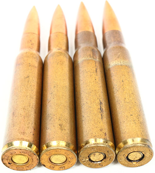 Lot of 4 Czech manufactured ammuniton. (2) h/s: P S 1948 7 mm Mauser (7 x 57) Manufactured in 1948. (2) 8mm h/s: ''4 50 * *''. Grade: Excellent - Value: 20 to 40