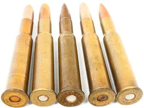 Lot of 5. 30-40 Krag. Two military loadings (HS:''F A 6 04) and 3 commercial rounds. Grade: Excellent - Value: 6 to 15