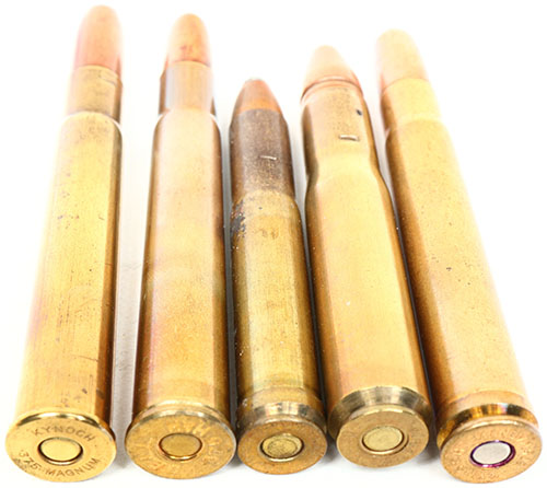 Lot of 5. (2) ..375 HH Flanged. 1--by Kynoch, HS:''KYNOCH .375 MAGNUM'', RN CJ SP. 1--by BELL, HS:''BELL 375 MAG, RN CJ SP. (1) .375 H&H Magnum, HS:''KYNOCH .375 MAGNUM'', RN CJ SP. (1) 400/375 B, HS:''HOLLANDS 400/375 NITRO''. (1) .425 Westley Richard Magnum, HS:''W.R. 425 K'', Semi Point CJ FMJ. Grade: Excellent - Value: 20 to 40