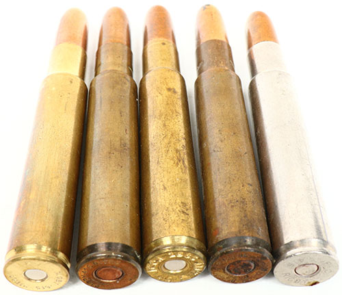 Lot of 5. .416 Rigby. (2) HS:''RIGBY 416 NITRO K'', RN CJ--1 is softnose and 1 is fmj. (1) HS:''F C 416 RIGBY'', RN CJ FMJ, Nickeled Case. (1) HS:''ICCA 1983 RIGBY 416'', RN CJ FMJ, A commemorative cartridge. (1) HS:''RIGBY 416 NITRO K'', RN CJ FMJ, small nickel primer. Grade: Very Good ++ - Value: 20 to 90