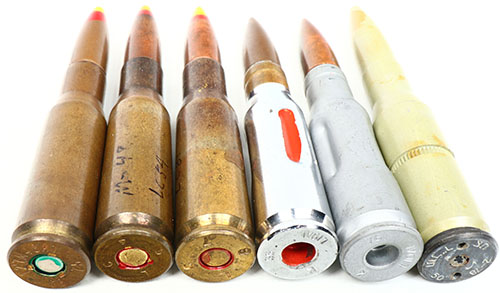 Lot of 6. .50 Cal ''BAT'' (Battalion Anti-Tank) rounds. (3) HS--:LC 54'', ''LC 87'', ''12.7M48A1 SB 75'', yellow over red tip. (3) Dummies: (1) HS:''K 66 L10A1'', Chromed w/ 3 flutes painted red & red blind primer pocket CJ FMJ. (1) HS''K 76 L10A1'', 3 flutes with NO paint, blind primer pocket. (1) Israeli Dummy, HS: Israeli symbols. One Piece. Grade: Excellent - Value: 20 to 40