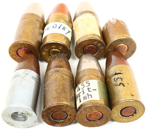 Lot of 8. .455 Webley Revolver. 6 Mk VI ball loads, 1 blank by Dominion and 1 dummy by Kynoch. Grade: Very Good + - Value: 20 to 40