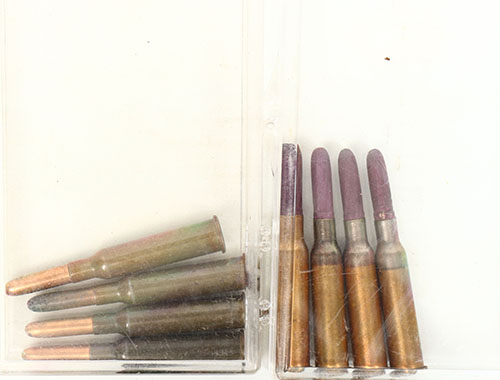 Lot of 8, 6.5 x 54 R Dutch Mannlicher Romanian Mannlicher.(4) German Ball Loads. (4) Wood bullet blanks. Grade: Very Good ++ - Value: 20 to 40