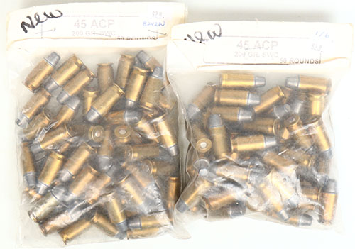 Lot of 100. .45 ACP. All are 200 gr. Semi-Wadcutter. 50 rounds each in two sealed bags. Grade: Excellent - Value: 40 to 80