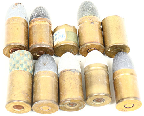 Lot of 10. .450 Revolver. Ball Loads: 4 by Kynoch, 2 by Eley, 1 unknown. Also 1 extended paper shot load, 1 primed empty case and 1blank by Gevelot. Grade: Very Good - Value: 20 to 40