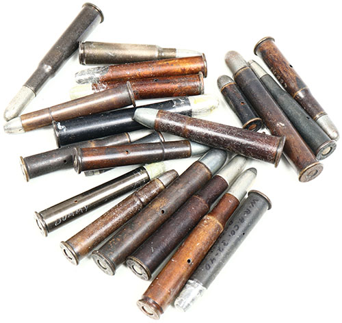 Lot of 21. Winchester blackened dummies. All appear to be different. All with small black holes in side of case. Grade: Very Good ++ - Value: 20 to 70