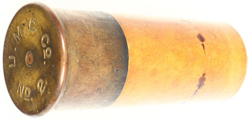 RARE! UMC No. 2 LOADED paper shotshell, 2 ga.! 4 1/2'' OAL, shell has age soiling with a few punctures to the top wad. Grade: Very Good - Value: 200 to 600