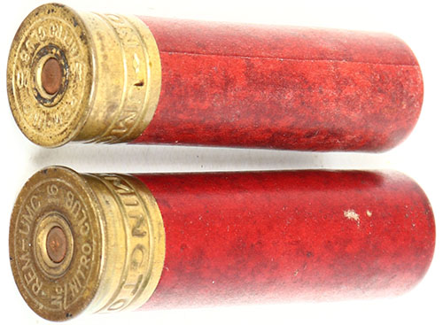 Lot of 2, TW= ''Remington GROUSE LOAD 7c'', H/S= ''REM-UMC NITRO CLUB'', 16ga & 20ga, 2 3/8'' OAL, red paper case. Grade: Very Good ++ - - Value: 10 to 50