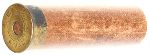 Winchester Rival No. 14, 14 gauge empty paper shotshell, H/S= ''W.R.A Co Rival No 14'', 2 1/2'' OAL, shows some wear. Grade: Very Good + - Value: 20 to 100