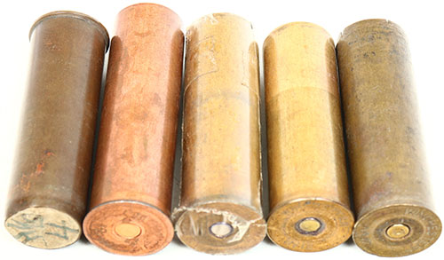 Lot of 5, various manufacturers, 12 ga., 4 loaded brass, 1 fired empty. Grade: Very Good ++ - Value: 10 to 50