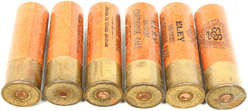 | Lot of 6, Eley Gas-Tight cartridge case, 14ga, 2 3/8'' OAL, lo...