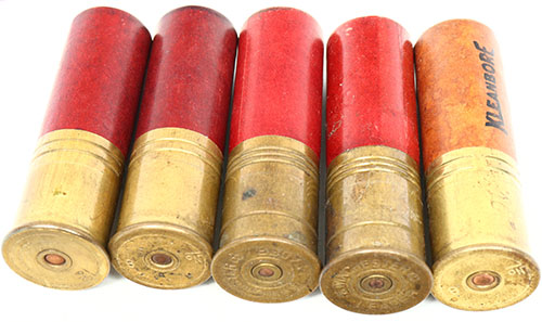 Lot of 5 loaded paper shotshells, 8 ga, various manufacturers, all solid. Grade: Very Good ++ - Value: 20 to 80