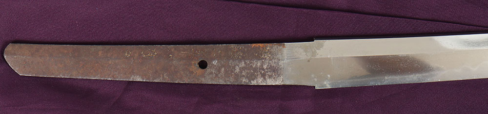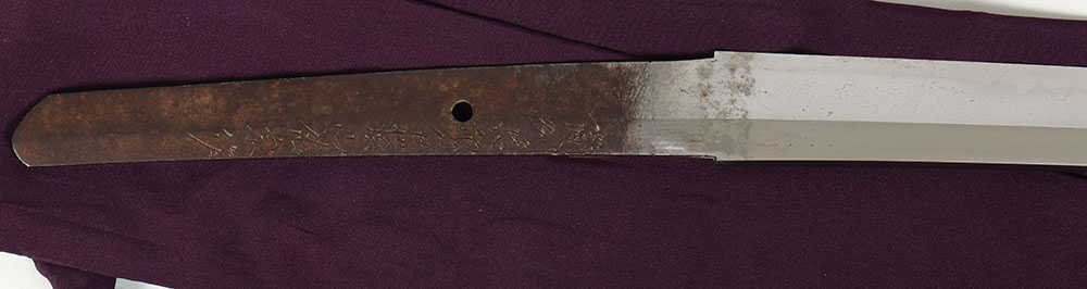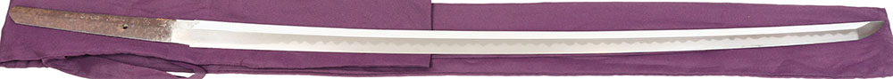 Antique Japanese Katana in beautiful condition, 37 1/2'' overall and 27'' cutting edge, Mounted in Shira saya - storage sheath, made from Japanese Magnolia wood. This particular sheath contains Sayagaki - Japanese inscriptions written on outside edge of sheath, not seen very frequently which usually contains information on who made, where made, and other information such as age of the blade within. This blade contains signatures and inscriptions on both side of the Nakago - tang, some of which has been translated with swordsmith's name as: Bishu Osafune ju Yokoyama Sukemune Saku. This Katana is in very good polish displaying vivid forging grain in the steel throughout the length of the blade. A beautiful, flowing, wavy Hamon - temper line, that clearly shows Nie and Nioi - crystallization within the metal along the edge of the Hamon, typically visible only on higher quality Japanese swords, The Hamon continues to be visible at the tip of the blade, a mark of an excellent tempering and polishing processes. Polisher's marks are visible under Habaki and at the Kissaki - tip of blade. The Habaki - metal collar around the blade above the tang that holds the blade securely in the scabbard, is two-piece copper with Shakudo - ''raven copper'' a shining black patina consisting of gold and copper. This Katana appears to be a Bizen province blade and dated 1865-1870. If you would like to preview these you will need to make an appointment before hand. - Value: 6000 to 10000