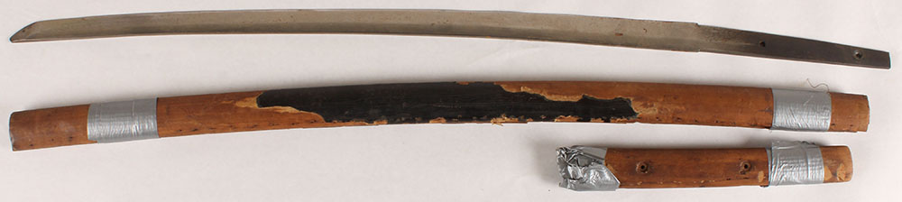 Japanese, WW2 era Katana, 24 3/16'' machine made blade. The tip of blade broken off, blade also has spots of rust, rust speckling, & patina. Sword is in its storage sheath & grip. Both the sheath & grip are falling apart & held together with tape. Grade: Good + - Value: 40 to 120