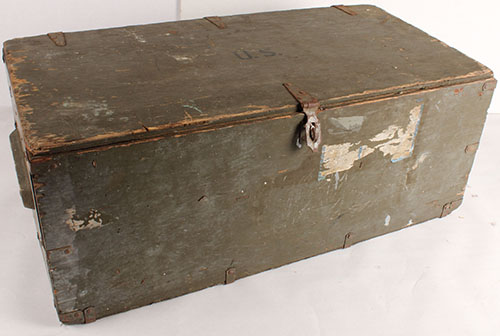 US, Navel MFG Co. Foor locker, 1943 dated, marked on back ''MARTHA L GIBSON'', trunk is empty, wood has chips, scuffs, & many dings on the edges, metal parts have rust. The foot locker is 33''x13''x13'', box is large & will be expensive to ship. Grade: Very Good - Value: 20 to 100