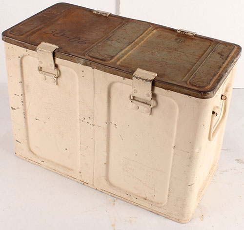 US, Mk1 20mm Ammo box, empty, N.S., 1945 dated, inside has rust. Grade: Very Good - Value: 10 to 40