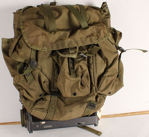 US, Field pack combat, Nylon, with frame, medium size, Gibraltar industries, the top carrying strap is broken, inside of pack has mold & mildew, frame has spots of rust. Grade: Very Good - Value: 60 to 200