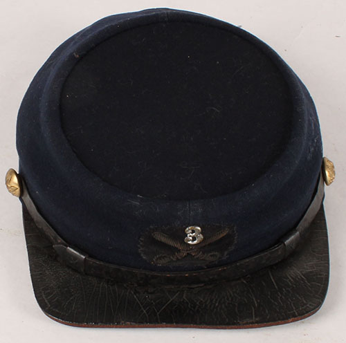 US, Union, Civil war Kepi, there is a Styrofoam block glued to the inside of the hat to keep its from disforming for display. Hat has wear on leather & the left side of the hat has wear holes. Grade: Very Good + - Value: 40 to 200