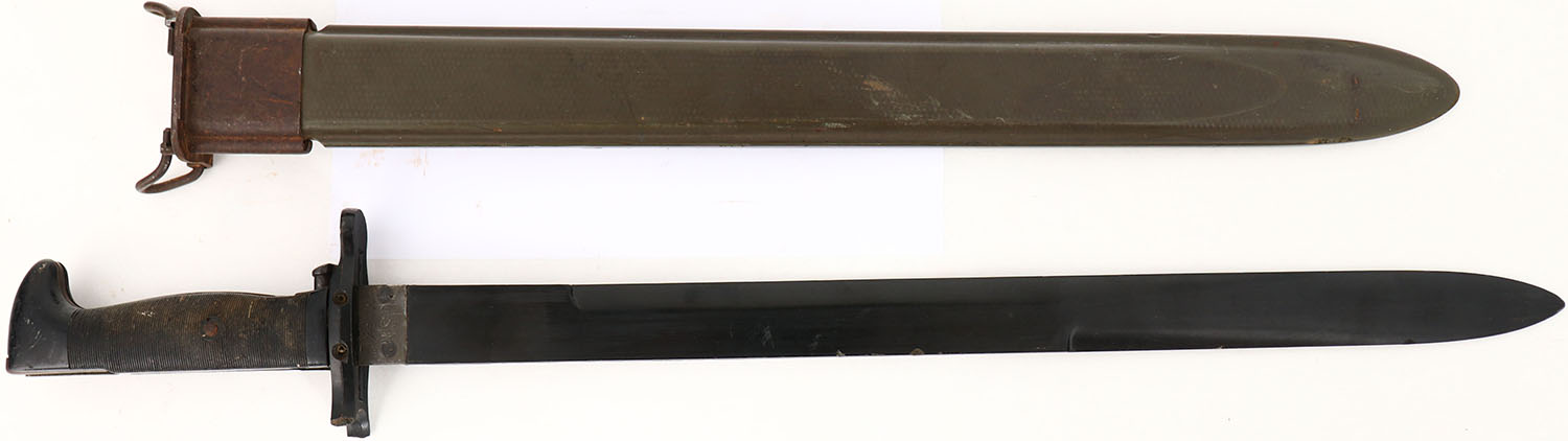 US Navy, Mark 1 plastic training bayonet, with correct sheath. Styled off the M1905 bayonet, the mark 1 is made entirely of sheet steel & hard, black Bakelite plastic. These bayonets being made of a early plastic were fragile & did not stand up to rigorous use, most examples today exhibit some damage. 300,000 bayonets are believed to have been produced between November 1942 & July 1943. The plastic blade has a few nicks, scratches, & scuffs but is in overall very good condition. Part of the barrel ring is broken off the guard. The grip & pommel also show scuffs & wear. Some of the metal screws have rust. The left side of the metal band of the blade is marked ''U.S.N.'', ''MARK 1''. The right side is marked ''B.M.Co'', ''NORD-3066''. The sheath is marked ''USN'', ''MK1''. The metal on the sheath has light rust & brown patina. Grade: Very Good + - Value: 100 to 300