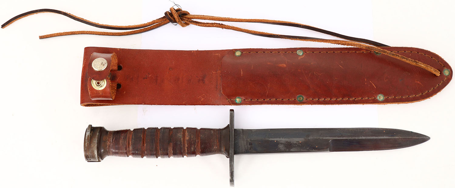 US, Japanese, M4 bayonet & sheath. The blade retains mostly full finish coverage with areas of wear & thinning. The guard & pommel retain almost full finish coverage with spots of wear. The leather grip has use wear, scuffs, & has been darkened from oils/age. The top of the guard is not marked. This sheath is not a original m4 bayonet. The back of the leather sheath is marked ''CAMILLUS'', ''U.S.A.''. Sheath has wear & scratches. Not much is known about these bayonets but its thought that these were made in Japan, & sold by the Kiffe sporting goods store here in the states, in the 1950's & 60's. They were sold as a accessory to the many surplus M1 carbines hitting the US civilian market, the Kiffe store also sold the M1 Carbines. The actual MFG of the bayonets in Japan is unknown, but is speculated to be Howa, since they were making M1 Carbines for the Japanese self-defense force, & for export sale. Grade: Excellent - Value: 80 to 160