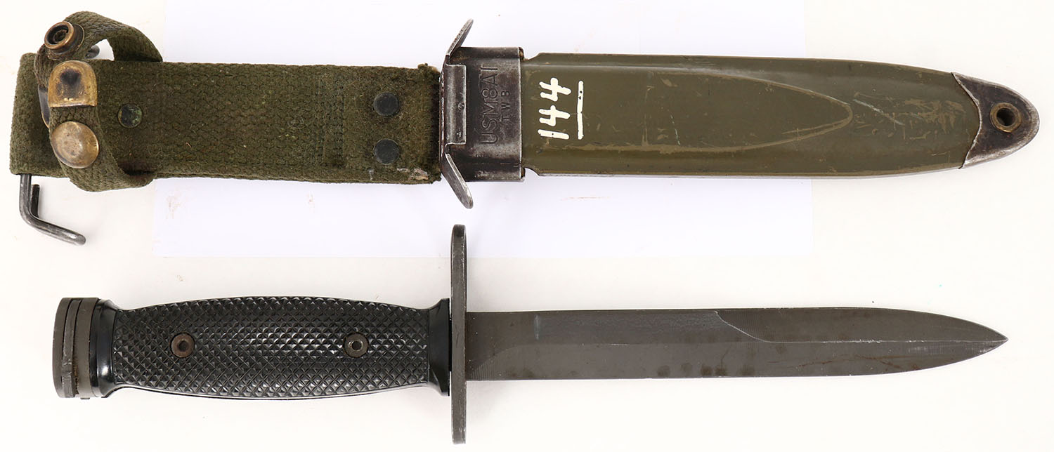 Korean, Korean Industries., M4 bayonet & sheath. The blade retains almost full finish coverage with sheath wear & scratches from use. The guard & pommel retain about full finish coverage. The black plastic grip has only light use wear. The top of the guard is marked ''U.S.M4'', flaming bomb, ''K.I.''. The sheath has scuffs & wear. The sheath is marked ''U.S.M8A1'', ''V.P.CO''. The front of the sheath is also marked ''144'' in white paint. This bayonet at first glace appears to be a Kinfolks 1st production bayonet. But the placement of the flaming bomb stamp, & the plastic grips are wrong. These bayonets were made in south Korea for use with the many surplus M1 carbines they received. Grade: Excellent + - Value: 50 to 150