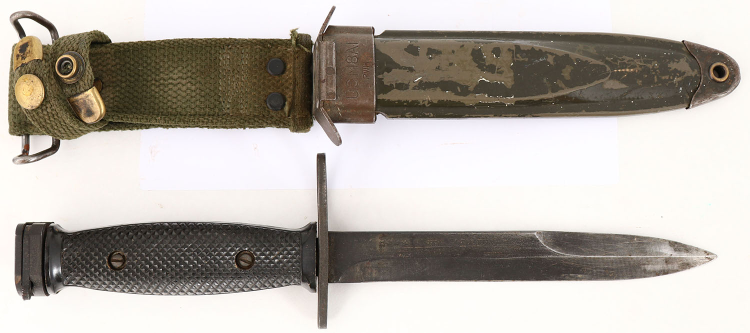 US, Imperial Knife Co., M7 Bayonet & sheath. The blade has almost full finish coverage with wear from the sheath & scratches. The guard & pommel retain full finish coverage with light wear from use. The black plastic grips have light wear. The top of the guard is marked ''U.S.M7'', ''IMPERIAL. The sheath has paint chips, scuffs, & wear. The sheath is marked ''USM8A1'', ''PWH'', the back of the sheath has a blue label with ''53'' in it. Grade: Very Good ++ - Value: 60 to 120