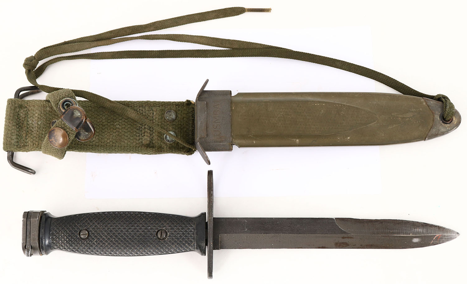 US, Bauer Ordnance Corp., M7 Bayonet & sheath. The blade has almost full finish coverage with wear from the sheath & scratches, blade also has spots of white corrosion. The guard & pommel retain full finish coverage with light wear from use. The black plastic grips have light wear. The top of the guard is marked ''U.S.M7'', ''BOG. The sheath has scratches, wear, & corrosion. The sheath is marked ''USM8A1'', ''TWB''. Grade: Very Good + - Value: 50 to 100