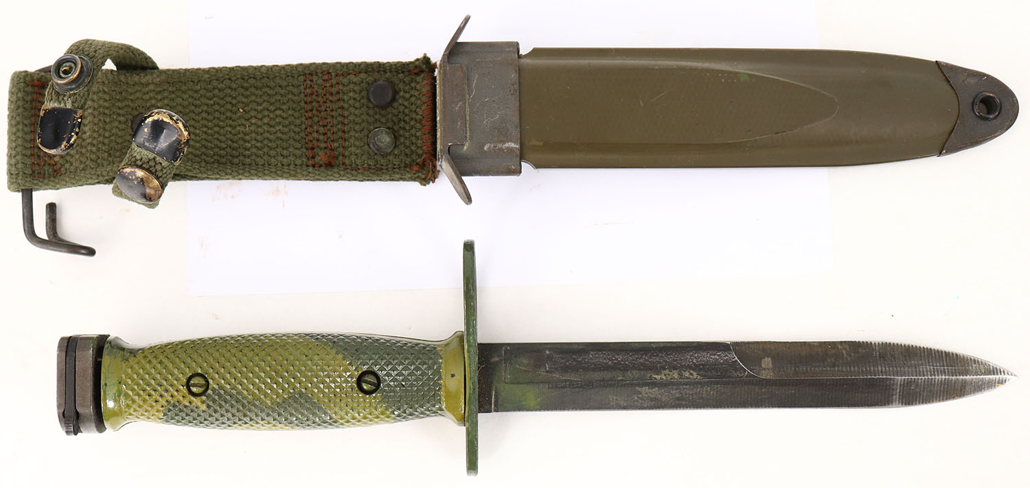 US, Bauer Ordnance Corp., M7 Bayonet & sheath. The blade has almost full finish coverage with wear from the sheath & scratches. The guard & pommel retain full finish coverage with light wear from use. The black plastic grips have light wear. The grip & sides of the guard have been painted with a green camo paint. The top of the guard is marked ''U.S.M7'', ''BOG. The sheath has scratches, & wear. The sheath is marked ''USM8A1'', ''TWB''. Grade: Very Good + - Value: 50 to 100