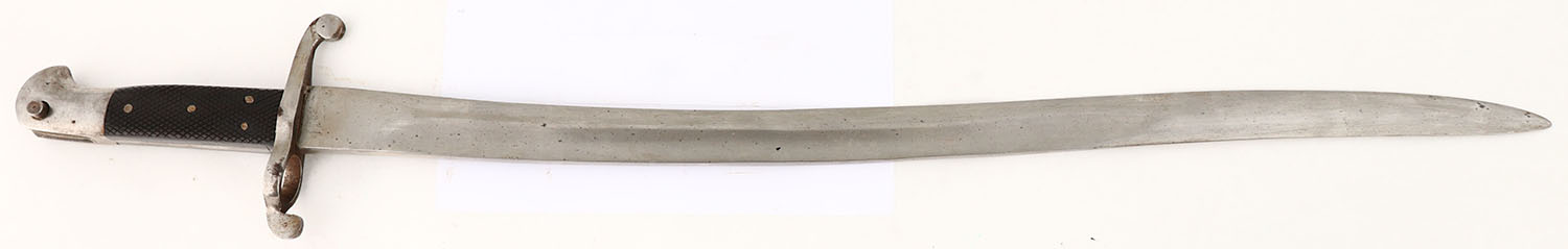 British, Pattern 1856 Yataghan Sword Bayonet, the blade has been buffed enough where the fuller on both sides is faint. Blade still has spots of patina. There are no visible markings on the bayonet. This sword bayonet was made for the 1853, .577 Caliber Enfield Rifled Infantry Short-musket. They were issued to many British units, & they were sold in large numbers to both union & confederate armies during the civil war, to use on bought 1853 Enfield muskets. Many of these bayonets would be converted to fit on martini-henry rifles as well. Grade: Very Good + - Value: 80 to 160