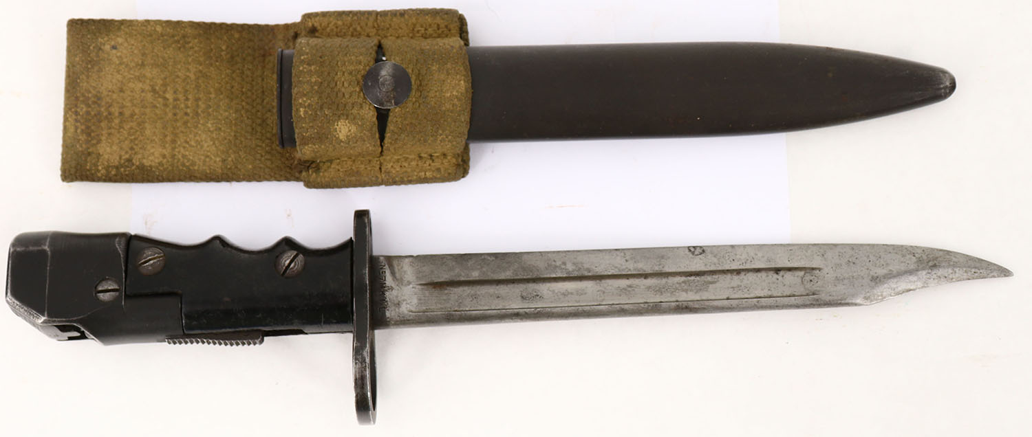 British, No.7 Mk.1/L Bayonet, with sheath & frog. The blade has areas of cleaned pitting. The right side of the blade is marked with a arrow proof mark over ''NO7M.K.1/L''. The right side of the pommel is marked with a broad arrow proof over ''M47A'', the ''A'' appears partial with only the right half visible. The sheath has light rust speckling. The No.7 Mk.1/L Bayonet was designed to mount to the No.4 SMLE rifle & the Mk.5 sten. This bayonet addressed a number of desires Britan wanted for a bayonet over their previous designs. They wanted to replace the No.4 spike blade, which nobody really liked, & use the clip-point blade from the No.5 Mk.1 Bayonet. One other thing is that they wanted it to serve as a real fighting knife. Even though these bayonets would mount to a No.4 rifle, they were never issued to the rifles, only being used for ceremonial purposes & on the Sten guns. The ''M47A'' marking is the manufactures mark. There were four manufactures of the bayonet, BSA which used ''M47B'', Elkington which used ''M-78'', ROF Poole which used a ''P'' inside a circle, & ROF Newport which MFG mark is unknown. The ''M47A'' mark was used by BSA Small Heath during the war, but they did not make this model of bayonet. Grade: Excellent - Value: 100 to 300