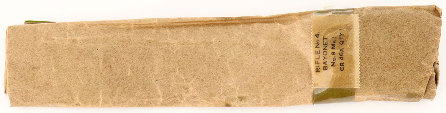 British, No.9 Mk.1 Bayonet, SEALED in original paper wrap. The front label is marked ''RIFLE.No4.'', ''BAYONET'', ''No.9Mk1'', ''CR 46A QTY 1''. Grade: Excellent ++ - Value: 50 to 100