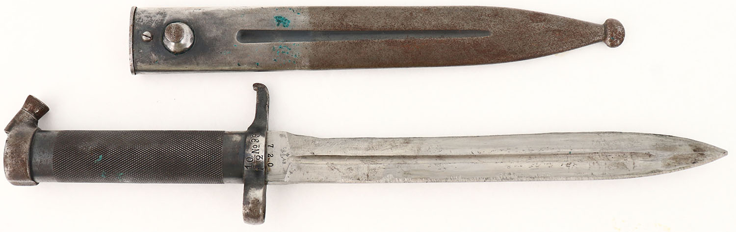 Swedish, Eskilstuna Jernmanufactur AB, M/1896 Bayonet with sheath. The blade has been sharpened, & has grind marks on both sides of the blade. The left side of the blade is marked ''EJ'', crown over a anchor ''AB'', ''720''. The right side of the blade is marked with a crown proof. The top of the guard is marked 720, the left side of the guard is marked ''10/I2 NO 99''. the sheath has finish wear , scratches, & rust speckling. Grade: Very Good + - Value: 30 to 60