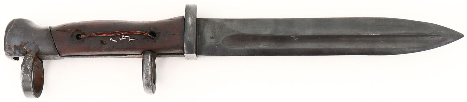 VERY SCARCE, ONE OF 3 KNOWN. Mexican Model 1910 Mauser Bayonet FAL trial conversion. The bayonet has been re-blued & has cleaned pitting under the finish all along the blade. There if a faint mark on the left side of the blade. The wood grips have small cracks, chips, dings, & wear from use. The grips are also held on with wire. Two muzzle rings have been welded to the back spine of the bayonet. The bayonet has a few spots of light rust. These bayonets were a attempt to convert the bayonets for the M1910 Mausers, for use with the FAL Mexico was about to adopt. Instead of buying new Bayonets from FN, they wanted to use up the large stockpile of bayonets they had. Ultimately it would not workout & Mexico would just buy the standard Bayonet from FN alongside the rifles. The consigner states this is one of three known to exist. Grade: Very Good - Value: 100 to 500